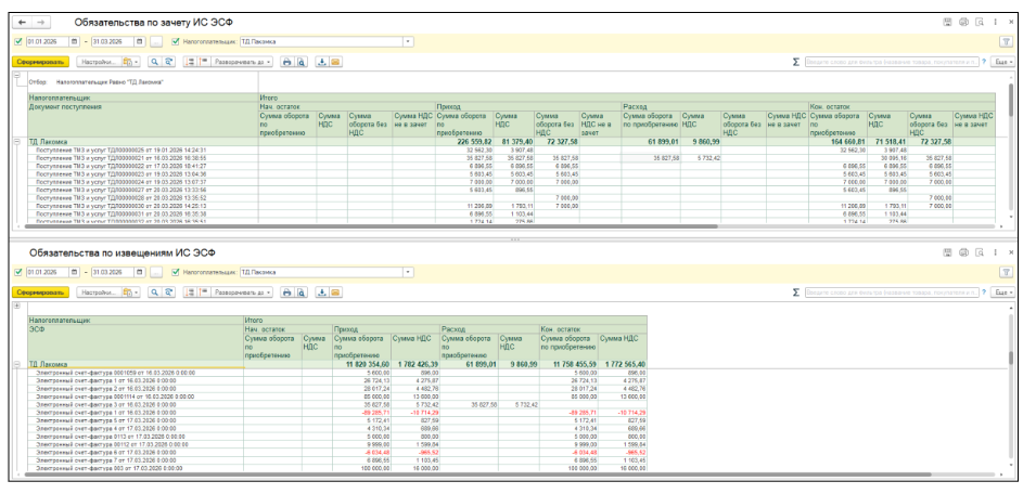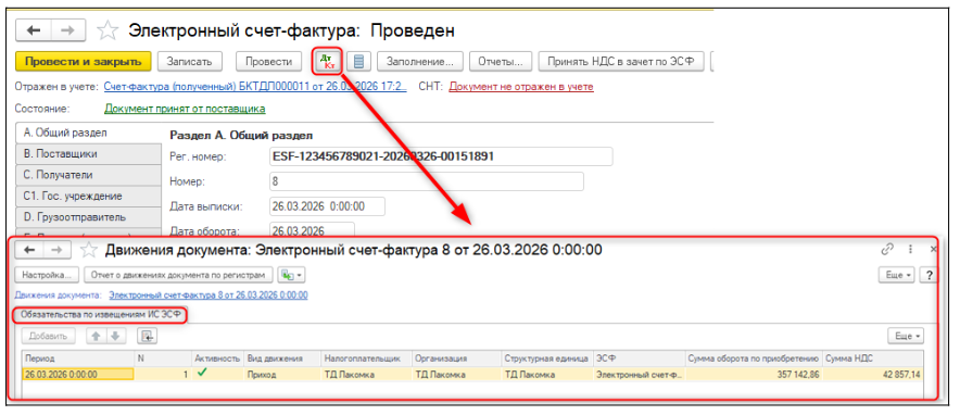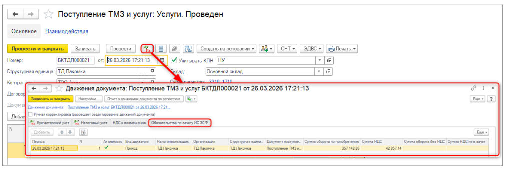 Далее при проведении учетного первичного документа поступления, формируются движения по сумме НДС, которую налогоплательщик фактически берет в зачет в налоговом периоде, по регистру Обязательства по зачету ИС ЭСФ.