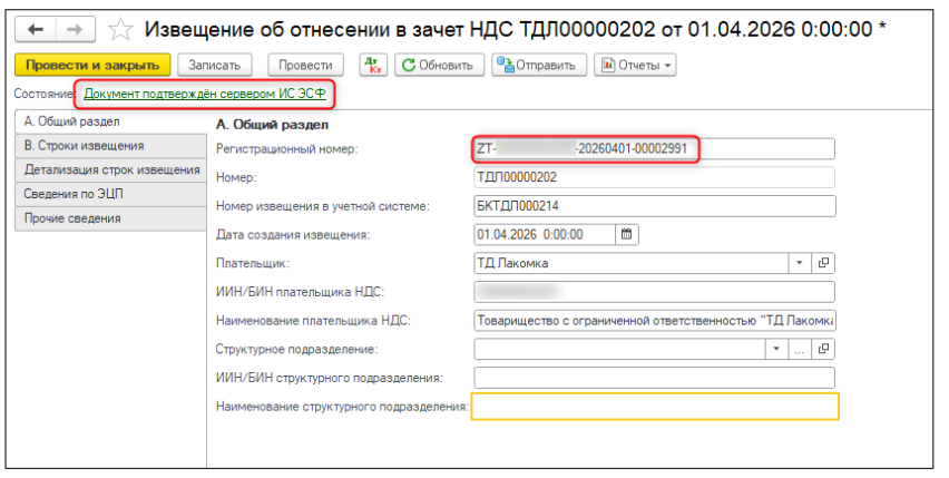 После заполнения, с помощью команды Отправить, документ отправляется на портал ИС ЭСФ. После того как документ успешно принят сервером ИС ЭСФ обновляется состояние документа - Документ подтвержден сервером ИС ЭСФ и присваивается регистрационный номер с портала ИС ЭСФ