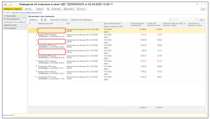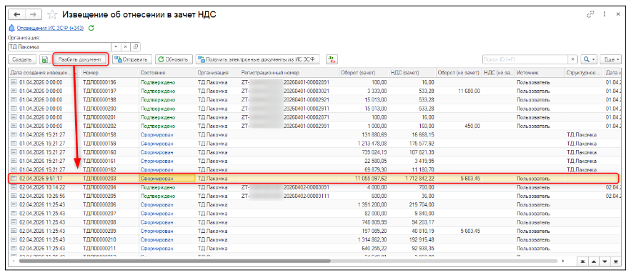 Документ Извещение об отнесении в зачет НДС может содержать не более 500 строк. В связи с этим реализован механизм разбиения документа на несколько отдельных документов по 500 строк, для успешной отправки на портал. Команда Разбить документ доступна из формы списка.