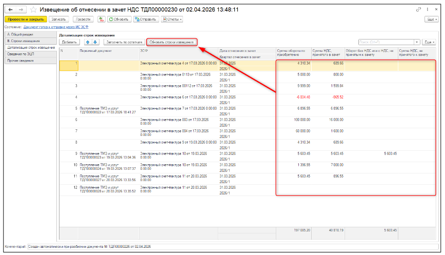 В разделе Детализация строк извещения предусмотрена возможность переноса итогов всех суммовых показателей в раздел В. Строки извещения с помощью команды Обновить строки извещения, в случае если данные раздела Детализация строк извещения откорректированы вручную.