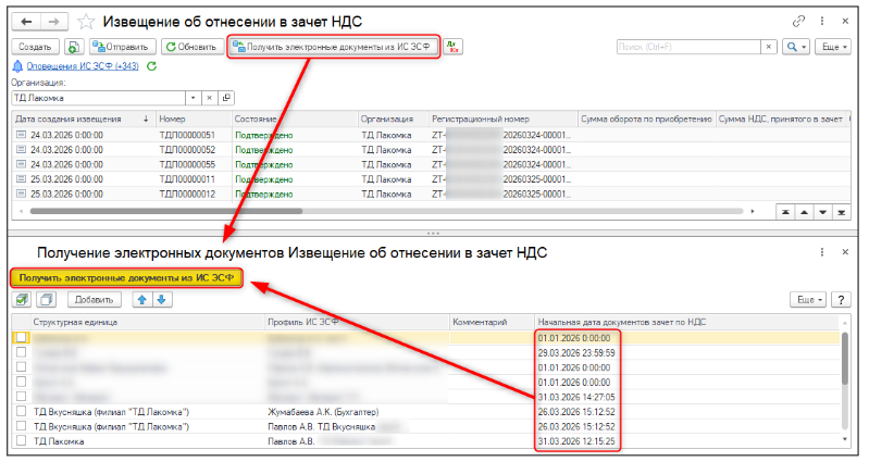 Реализован механизм получения документов Извещение об отнесении в зачет НДС, оформленных на портале по команде Получить электронные документы из ИС ЭСФ в форме списка, предварительно указав начальную дату, с которой необходимо загрузить документы Извещение об отнесении в зачет НДС.