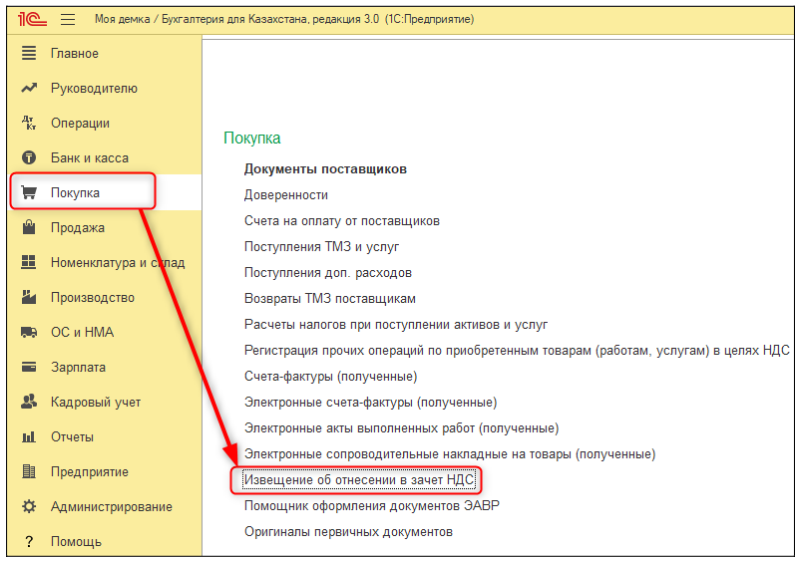 Извещение об отнесении в зачет НДС для синхронизации данных по зачету НДС с порталом ИС ЭСФ расположен в разделе Покупка.