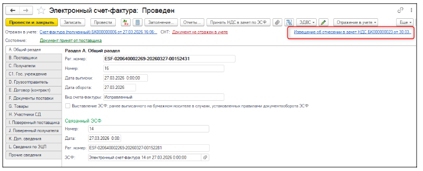 В ЭСФ, по которому уже зафиксированы данные по зачету НДС, отображается гиперссылка на документ Извещение об отнесении в зачет НДС.