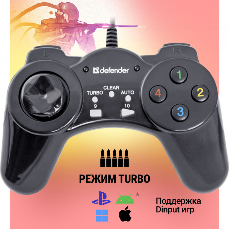 С проводным геймпадом Defender Vortex, предназначенным для PC, любая игра станет интересной и увлекательной. Геймпад оснащен интерфейсом USB. Defender Vortex имеет достаточно длинный кабель (1.5 м). Устройство в стильном и эргономичном пластиковом корпусе выполнено в классическом стиле. Корпус выдерживает внушительные эксплуатационные нагрузки и является ударопрочным. Клавиши расположены таким образом, чтобы игроку было максимально удобно.